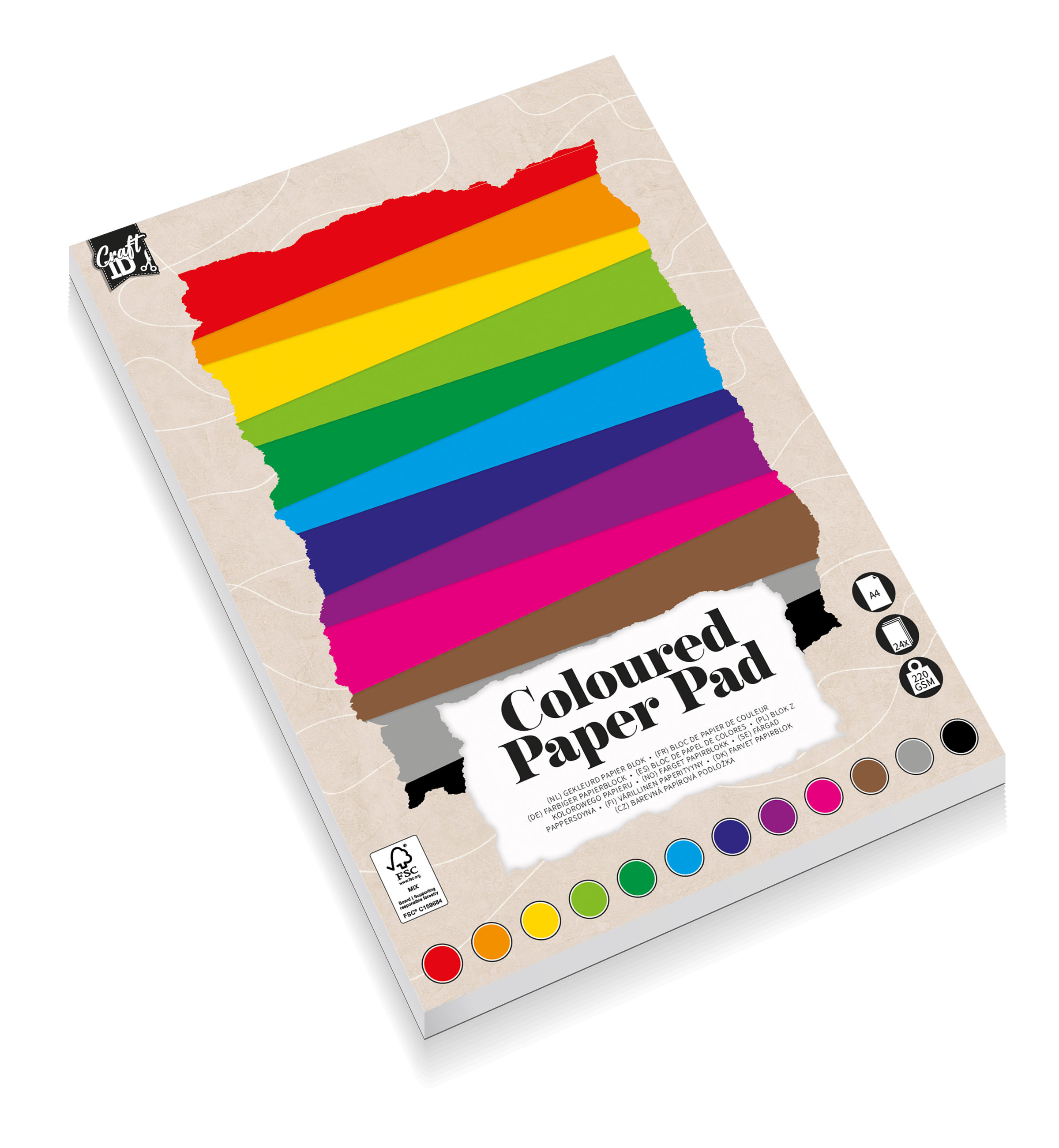 24 listů barevných papírů - červený, oranžový, žlutý, sv. zelený, tm. zelený, sv. modrý, tm. modrý, fialový, růžový, hnědý, šedivý a černý.