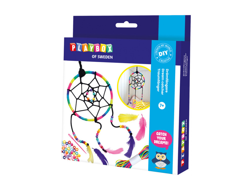 Balení obsahuje: 1x kruh, 1x bavlnka duhová 5,5 m, 1x bavlnka černá 5 m, 3x barevná peříčka, cca 35x barevné korálky, 1x plastová jehla, 1x obrázkový návod.